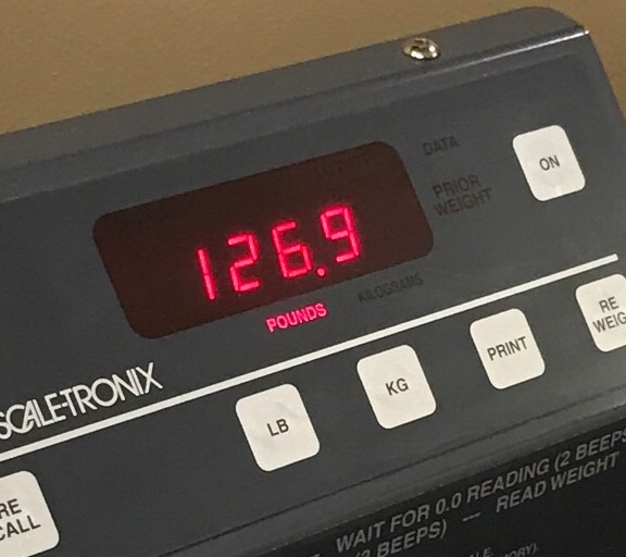 You can see below, the scale shows his weight as of today: 126.9 pounds. Amazing. What’s even better in my eyes is that he got up and walked down the hall to stand on the scale. Based on how he looked earlier this week, the events of today seemed impossible.